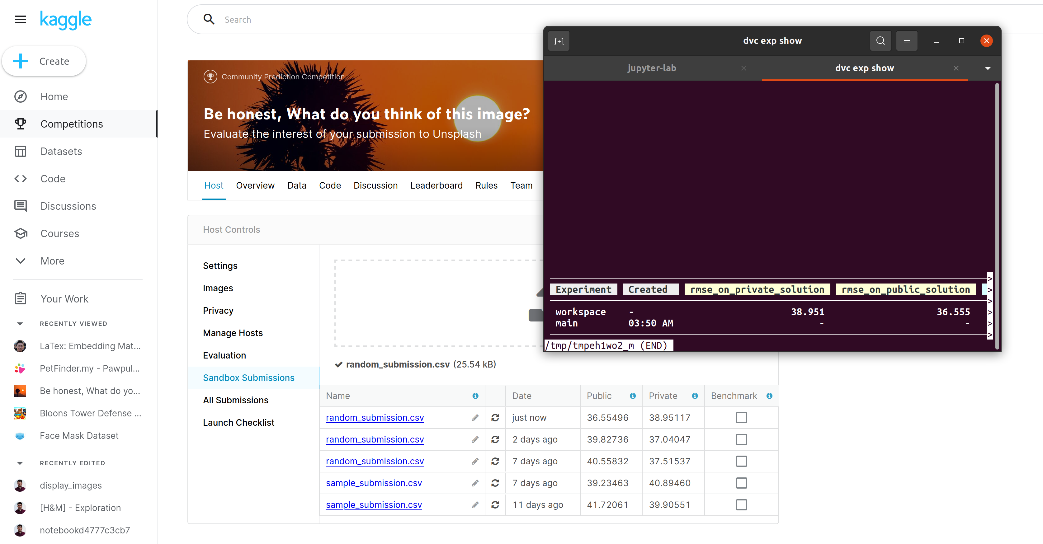 Another feature that can be useful in this evaluation context is the ability to build metrics. In the last step, compute RMSE, you can see a notion of metric in the configuration file (a JSON with the RMSE values on the public and private leaderboards data). This notion of a metric is handy because DVC plays the role of the orchestrator of tasks. It can also save information on the execution (in this case, the RMSE), version it with Git, and save some history on his evolution. I quickly tested my rmse locally, and the RMSE computed on the kaggle tool is pretty similar (as expected).