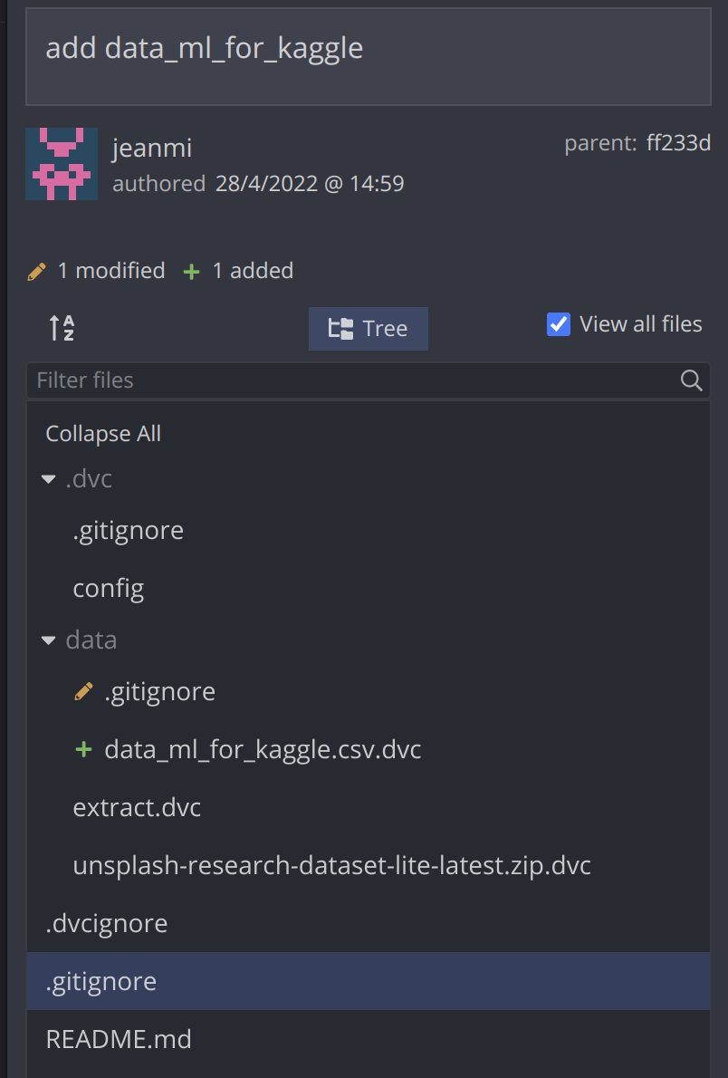 When adding a new file in the project with the command dvc add data/data_ml_for_kaggle.csv, there is an update of a gitignore tight to the data folder and a .dvc file added to the Git repository that contains detail on the new file in the remote storage.