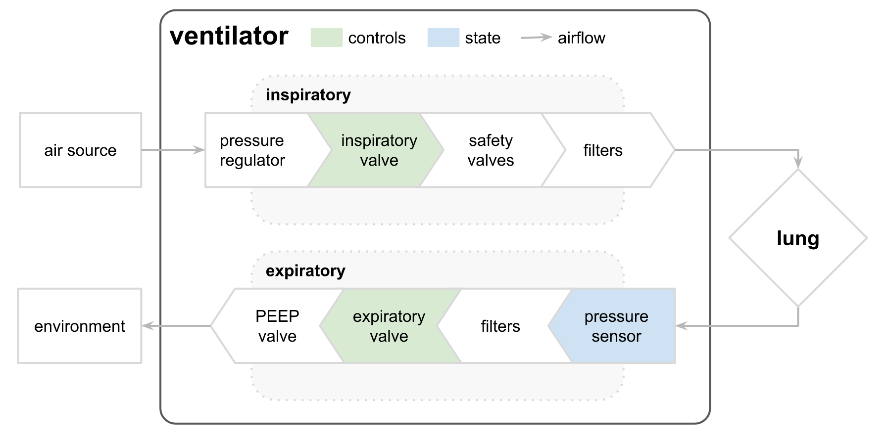 Données: Les données de ventilateur utilisées dans cette compétition ont été produites en utilisant un ventilateur open-source modifié connecté à un poumon de test bellows artificiel via un circuit respiratoire. Le diagramme ci-dessous illustre la configuration, avec les deux entrées de contrôle mises en évidence en vert et la variable d’état (pression des voies aériennes) prédite en bleu. La première entrée de contrôle est une variable continue de 0 à 100, représentant le pourcentage de la valve solénoïde inspiratoire ouverte pour laisser l’air entrer dans le poumon (c’est-à-dire, 0 est complètement fermé et aucun air n’est laissé entrer, et 100 est complètement ouvert). La deuxième entrée de contrôle est une variable binaire représentant si la valve exploratoire est ouverte (1) ou fermée (0) pour laisser l’air sortir.