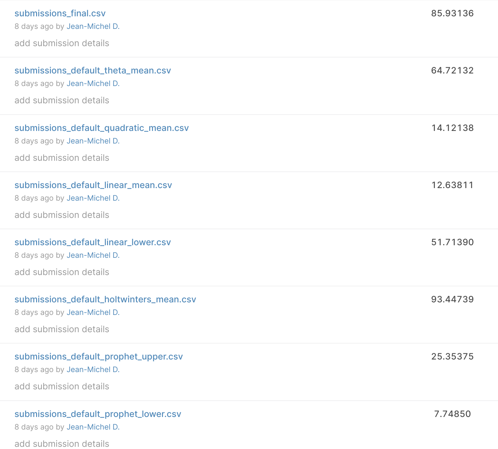 J’arrive à avoir un SMAPE (métrique d’évaluation de la compétition) de 7,7 ; actuellement, le meilleur modèle sur le classement public est 3,9, donc pas si mal pour un premier modèle (merci prophet borne inférieure).
