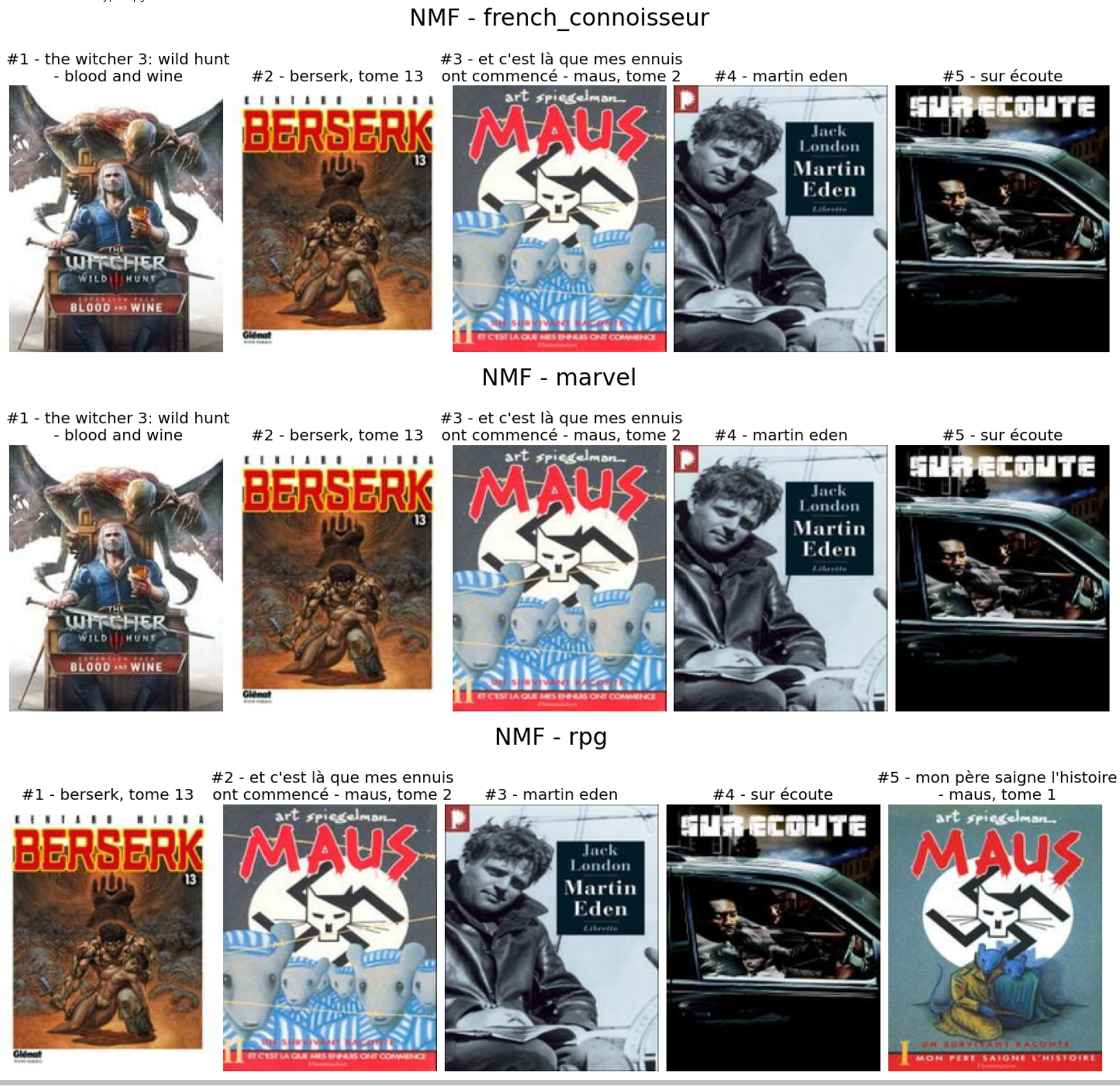 Encore une fois, conclusion très proche que pour le NMF … Et pour conclure, il y a des recommandations de la ligne de base KNN (utilisateurs).