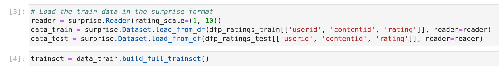 Le format est pratique car il encodera les identifiants d’utilisateur et d’article pour répondre aux besoins de la construction du modèle dans l’entraînement (et cet encodage sera conservé après le calcul de la recommandation).