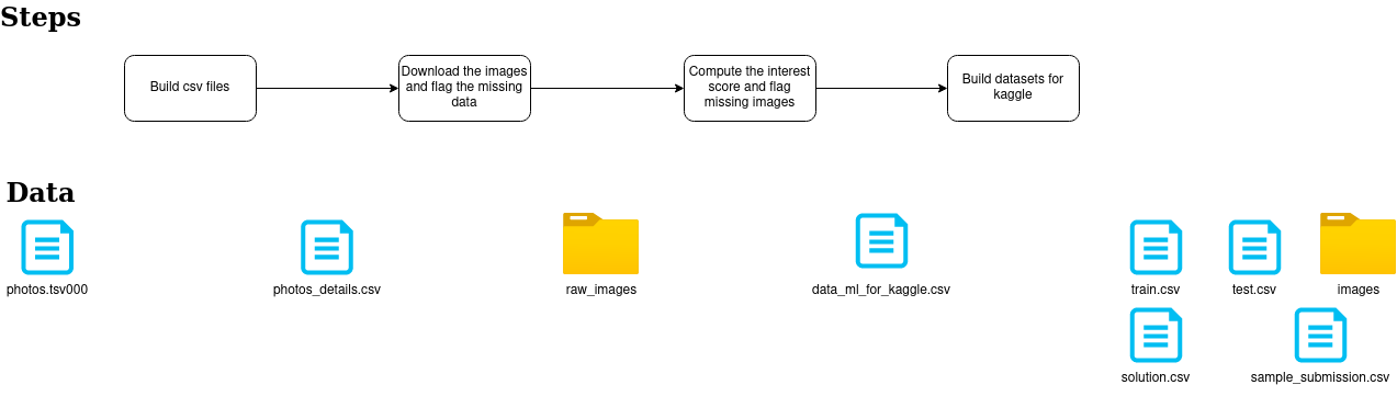 - the last step is to build the files and reformat the dataset to the Kaggle requirements (for the images folder, there is a zip file for the train images and test images, it helps for the upload on Kaggle)