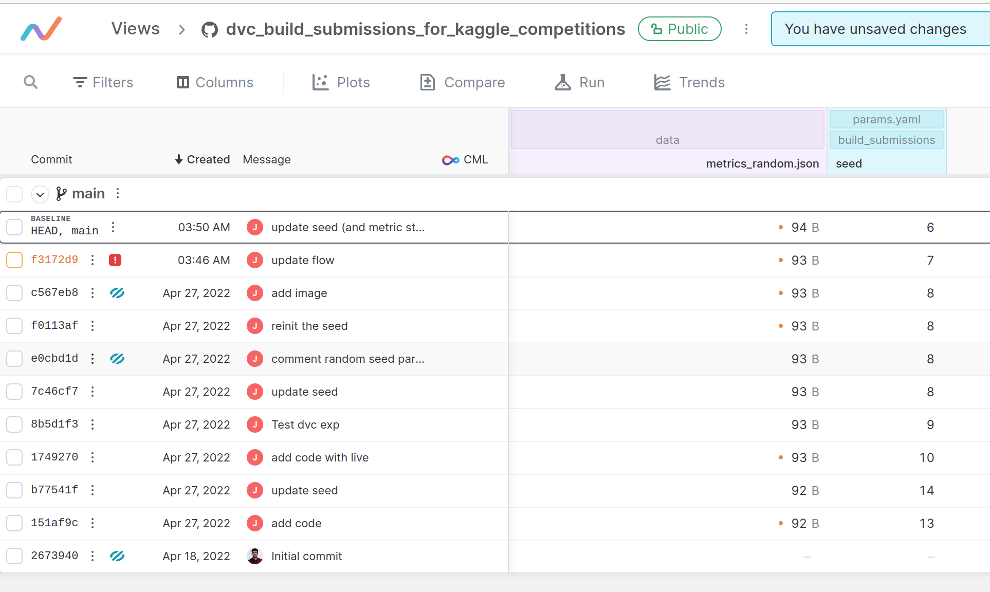 The tool offers a very nice way to check the evolution of params in the configuration file, for example (in my case, the seed for the random submission) with a link to the various commit on the repository.