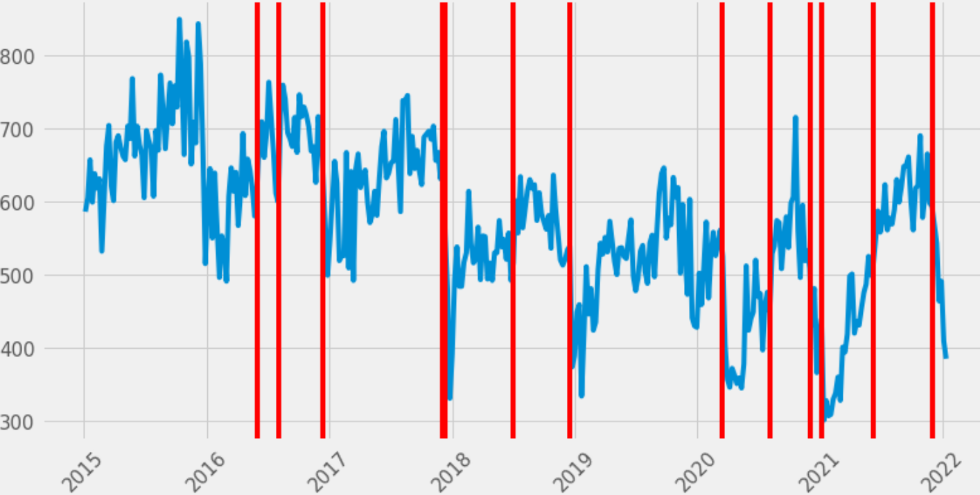De nombreuses anomalies sont détectées le long des données historiques, et quelques anomalies sont liées au confinement covid (cf mon article à ce sujet).