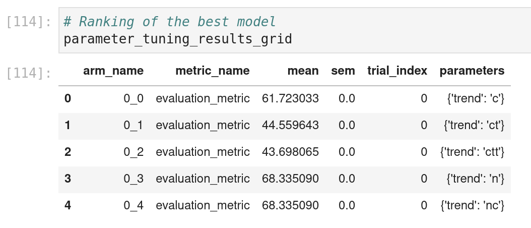 Optimisation des hyperparamètres: Pour cette expérience, l’idée était de tester un nouveau type de modèle pour les optimiser. Le modèle multivarié “est une extension multivariée du modèle autorégressif (AR) univarié. Il capture les interdépendances linéaires entre plusieurs variables en utilisant un système d’équations. Chaque variable dépend non seulement de ses propres valeurs retardées, mais aussi des valeurs retardées d’autres variables” ; fondamentalement, plusieurs colonnes sont fournies pour construire un modèle de prévision pour chaque colonne.