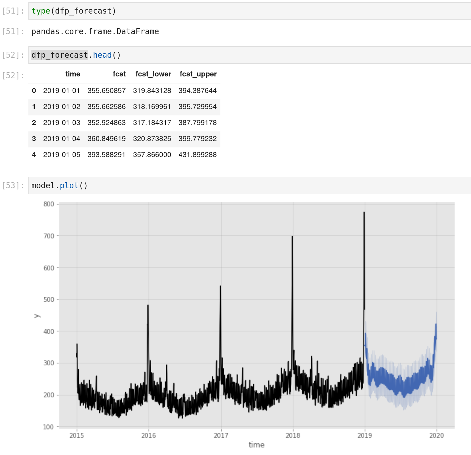 - La fonction predict donne la possibilité de définir le nombre de jours dans le futur pour faire la prédiction (la façon d’entraîner et de prédire est très similaire au package Prophet de Prophet)