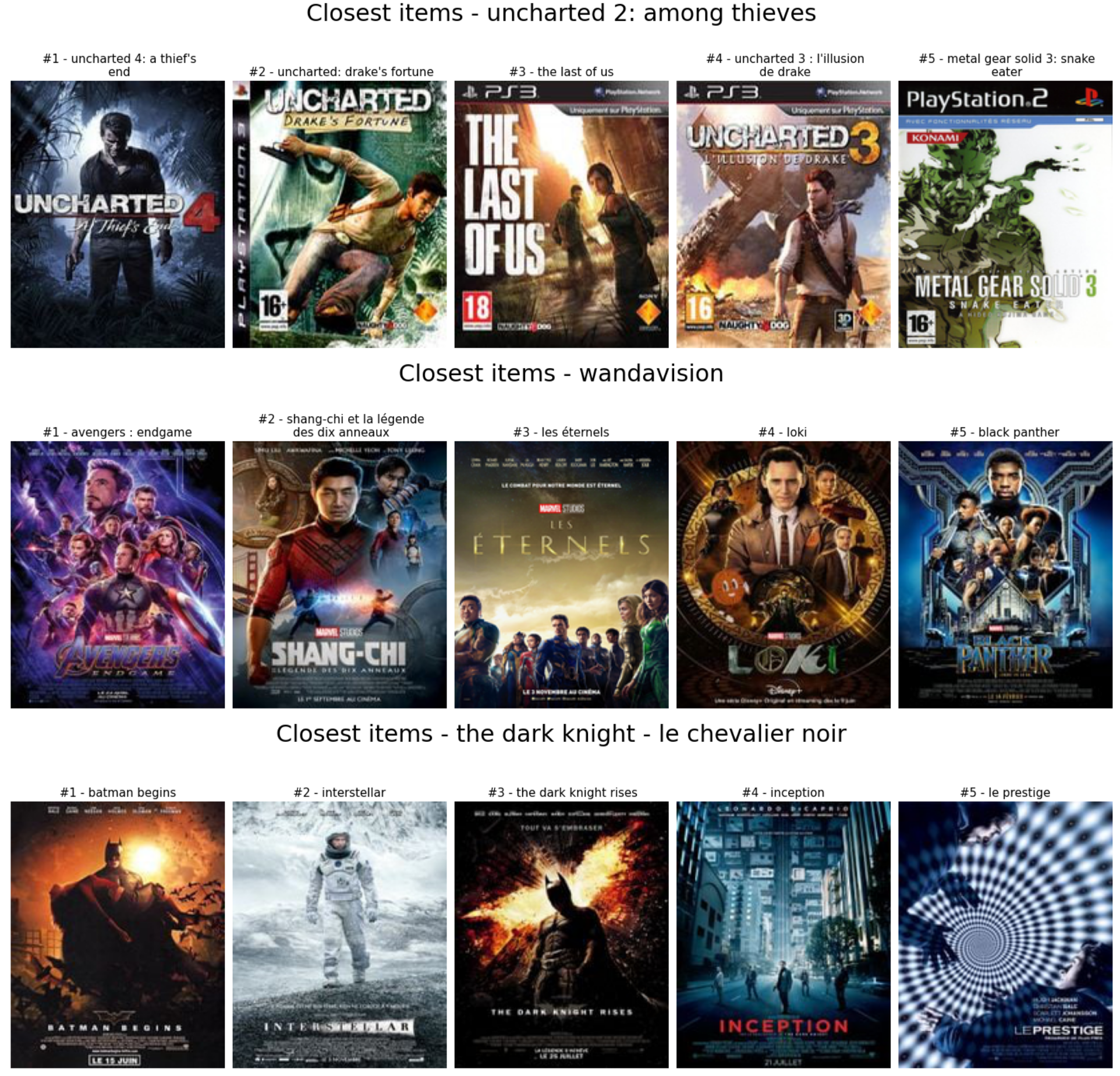 Il est très simple d’extraire les plus proches voisins d’un utilisateur ou d’un article à partir d’un modèle basé sur les algorithmes. Pour illustrer cela, j’ai utilisé le KNN articles d’avant pour obtenir les cinq articles les plus proches des contenus suivants.