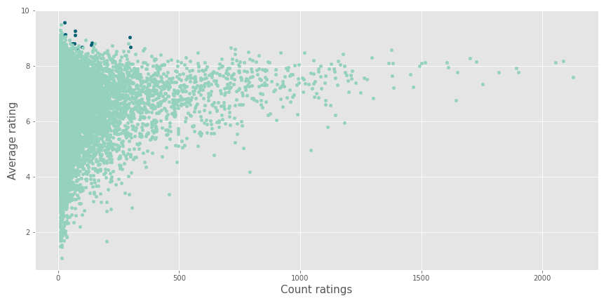 Les contenus recommandés (en bleu foncé) semblent être des valeurs aberrantes avec quelques critiques et une excellente note moyenne.