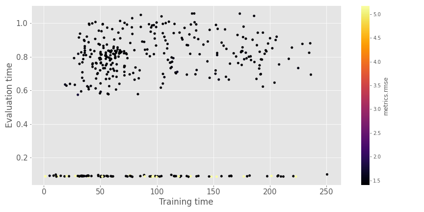 Dans l’ensemble, il semble que la barrière de 1,4 soit difficile à battre (sur le temps et l’espace de recherche que j’ai alloué), et les trois algorithmes semblent avoir des résultats très proches. Le résultat n’est pas fou (ne pas avoir quelque chose sous un RMSE de 1), mais le système apprend les relations entre utilisateur et article par rapport aux modèles de base. Dans ce deuxième graphique, il y a une comparaison du temps d’évaluation et du temps d’entraînement pour les différentes expériences.